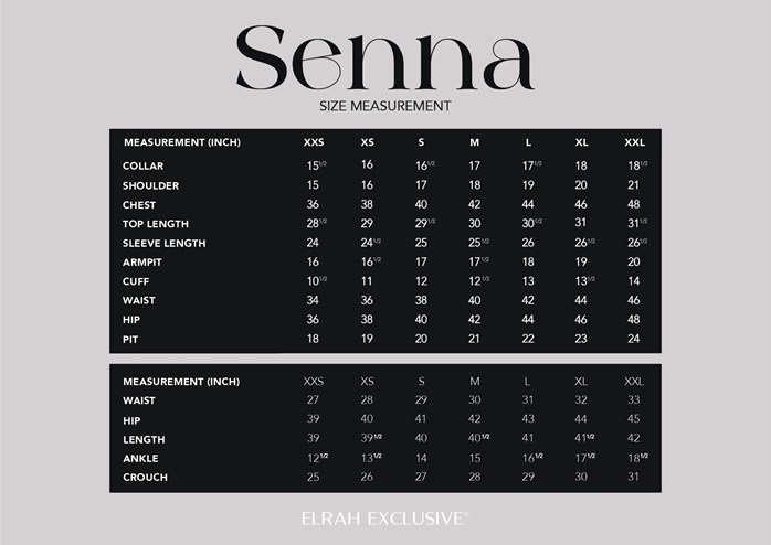 Oleh itu, Baju Melayu Senna ditawarkan dalam pelbagai saiz, dari XXS hingga XXL.